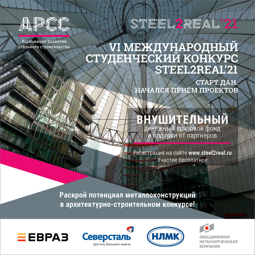 Начался первый этап престижного международного конкурса студенческих проектов Steel2Real’21, проводимого Ассоциацией развития стального строительства (АРСС). Конкурсантам предстоит описать и обосновать внешний и внутренний виды здания общежития, его пространственную, планировочную и функциональную организацию, архитектурно-художественные решения, а также варианты по отделке помещений.