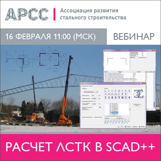 16 февраля в 11:00 по Московскому времени Ассоциация развития стального строительства (АРСС) проведет бесплатный вебинар на тему «Расчет ЛСТК в SCAD++».