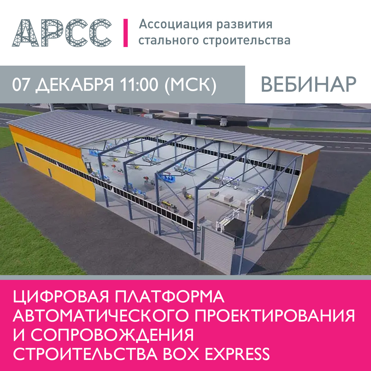 7 декабря в 11:00 МСК Ассоциация развития стального строительства (АРСС) проведет бесплатный вебинар на тему «Цифровая платформа автоматического проектирования и сопровождения строительства BOX EXPRESS».