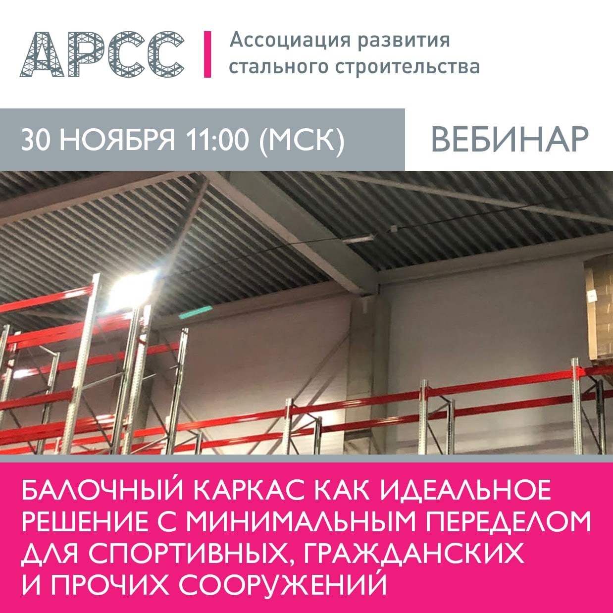 30 ноября в 11:00 МСК Ассоциация развития стального строительства (АРСС) проведет бесплатный вебинар на тему «Балочный каркас как идеальное решение с минимальным переделом для спортивных, гражданских и прочих сооружений».
