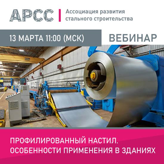 13 марта 2024 г. в 11:00 (МСК) Ассоциация развития стального строительства (АРСС) проведет бесплатный вебинар на тему «Профилированный настил. Особенности применения в зданиях».
