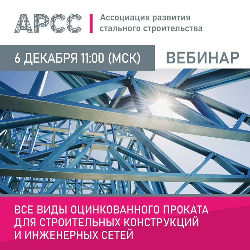 6 декабря 2023 г. в 11:00 (МСК) Ассоциация развития стального строительства (АРСС) проведет бесплатный вебинар на тему «Все виды оцинкованного проката для строительных конструкций и инженерных сетей».