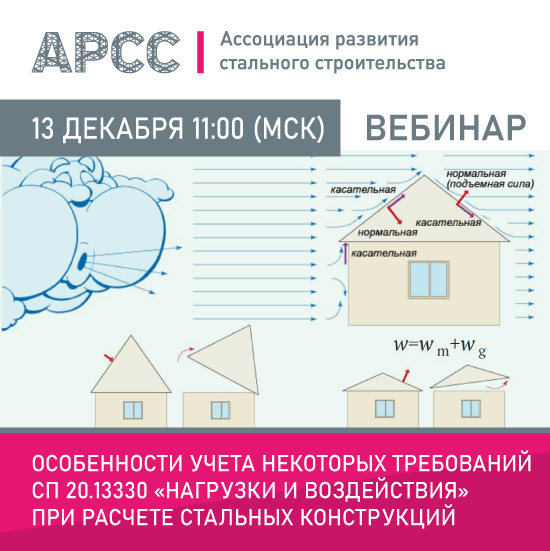 13 декабря 2023 г. в 11:00 (МСК) Ассоциация развития стального строительства (АРСС) проведет бесплатный вебинар на тему «Особенности учета некоторых требований СП 20.13330 "Нагрузки и воздействия" при расчете стальных конструкций».