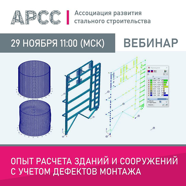 29 ноября 2023 г. в 11:00 (МСК) Ассоциация развития стального строительства (АРСС) проведет бесплатный вебинар на тему «Опыт расчета зданий и сооружений с учетом дефектов монтажа».