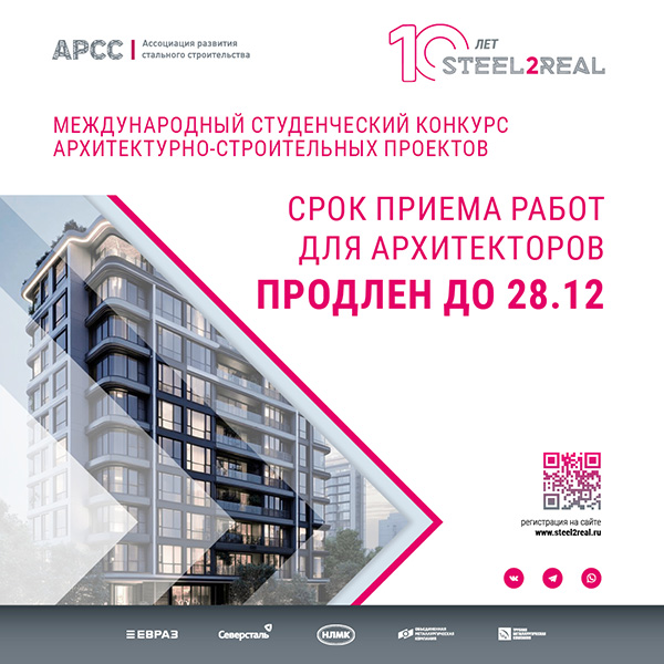 По просьбам участников продлевается срок приема работ архитекторов на десятый Международный студенческий конкурс архитектурно-строительных проектов Steel2Real до 28 декабря (суббота) включительно.